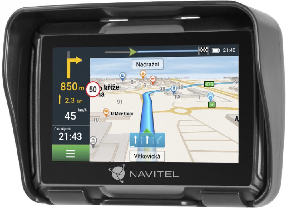 Moderní navigace NAVITEL G550 je robustní motocyklová navigace ovladatelná i v rukavicích s displejem o úhlopříčce 4,3 palce. Perfektní řešení pro váš motocykl NAVITEL G550 je vodotěsný, odolný proti nárazům a prachu, takže jej můžete bezpečně používat za všech povětrnostních podmínek. Zařízení splňuje mezinárodní standard IP-67. Přesná navigace Software Navitel Navigator nabízí hlasové pokyny a vizuální znázornění, které vám pomohou se soustředit pouze na řízení. Uživatel bude informován, zda překročí rychlostní limit nebo se přiblíží k dopravní kameře. Mapy 47 zemí Součástí zařízení je licence na mapy 47 zemí, z nichž některé jsou již v zařízení nahrány. Pomocí programu Navitel Navigator Update Center můžete aktualizovat seznam map, odstranit nepoužívané, nainstalovat potřebné a také aktualizovat stávající. Pro ukládání aktualizací map a záznamů tras může být nutné nainstalovat SD kartu (není součástí balení). Zařízení používá microSD až 32 GB pro ukládání dalších map a mediálních souborů.