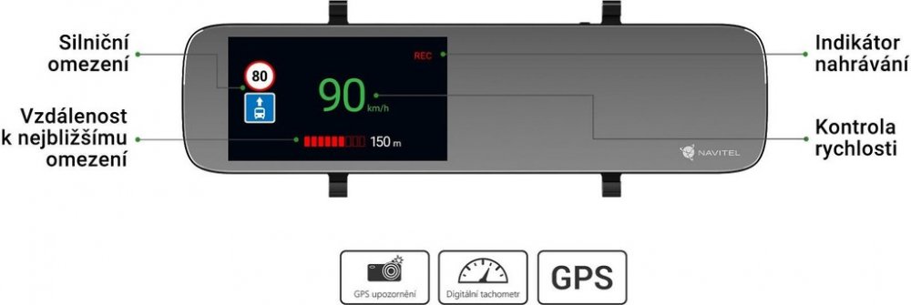 NAVITEL MR450 GPS je všestranné multifunkční zařízení s nejmodernějšími technologiemi. Chytré zrcátko s funkcemi digitálního tachometru a GPS informátoru.