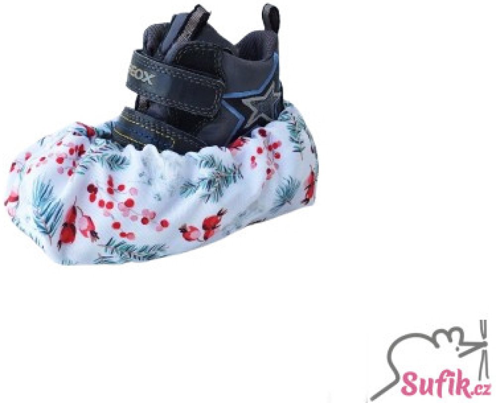 Jsou ušity z nepromokavé kočárkoviny. Špička je useknutá a pata naopak přizpůsobena tvarem i vyšší a širší zimní botě. Vzadu na patě je ponechána dírka na regulaci gumy. Takže pokud jsou moc volné, vytáhněte gumu a uzlíkem utáhněte.