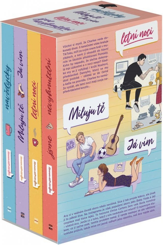 Navždycky, Miluju tě. Já vím, Letní noci a Jsme nevyhnutelní. Mei, Ava, Charlee a Harper. Čtyři hrdinky, každá jiná, každá hlavní postavou svého romantického příběhu. Přečtěte si čtveřici knížek plných humoru, lásky, chatů, obrázků, písniček, stories a popkulturních odkazů, tentokrát v dárkovém balení pěkně v duhovém boxu. Zamilujte se do příběhů Nofreeusernames zas a znovu!