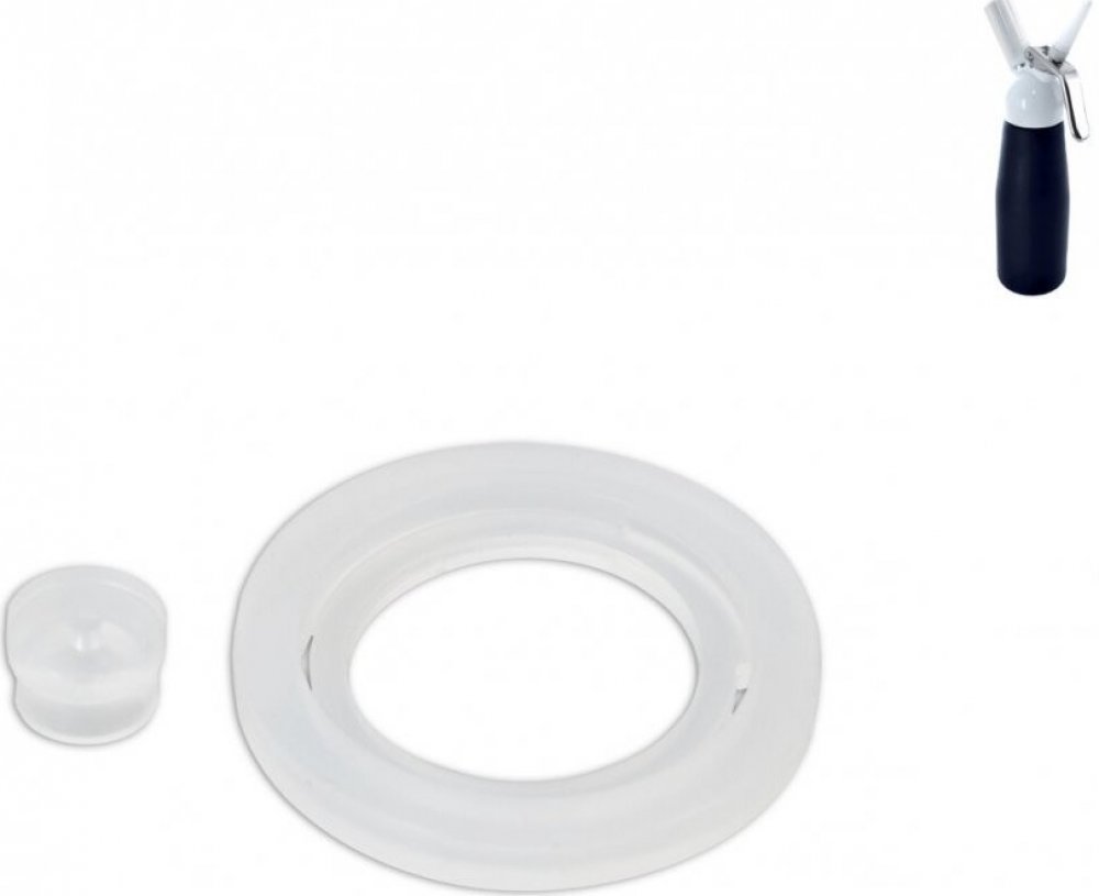 Silikonová těsnění k šlehačkové lahvi. Těsnění pod hlavu lahve - pr. 4,7 cm, těsnění pod bombičku - pr. 1,2 cm. Náhradní díl je vhodný k láhvi 130624.