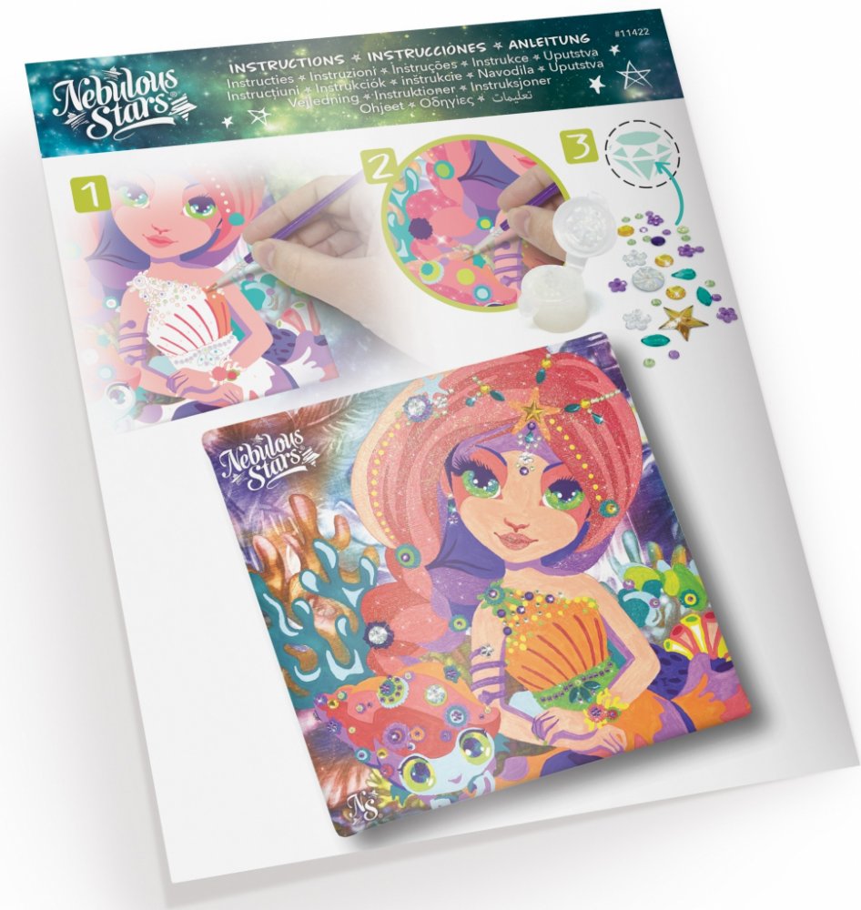NEBULOUS STARS - Kreativní tvoření Coralia a Lyria Klasická aktivita založená na malování podle čísel na tištěném plátně s dřevěným rámem. Dodej obrázkem špetku zářivosti pomocí drahokamů a třpytivého laku.