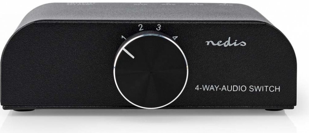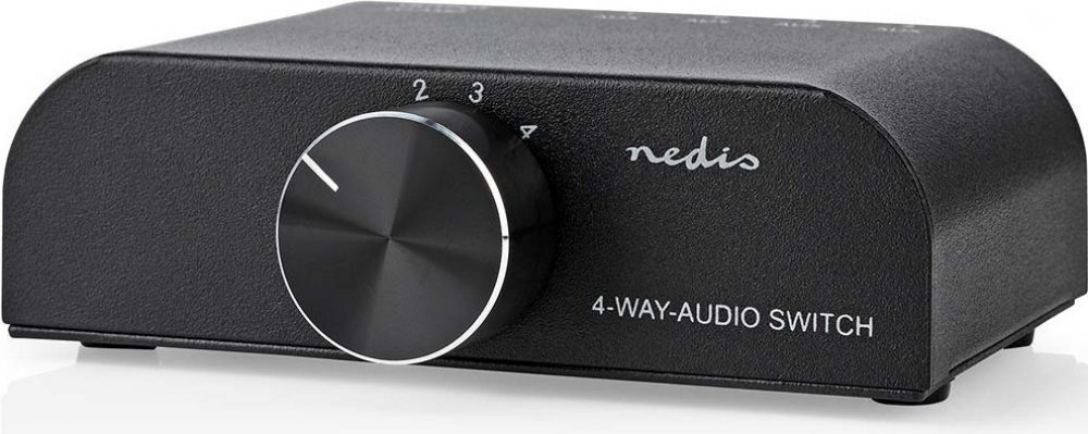 Pomocí tohoto analogového stereofonního audio přepínače od společnosti Nedis můžete připojit tři zařízení se stereofonními audio přípojkami RCA a další zařízení přes 3,5mm konektor k zesilovači/přijímači se stereofonními audio přípojkami RCA. Tento propojovací box je obousměrný, a proto funguje i v případě, že chcete připojit jedno zařízení ke čtyřem zesilovačům/přijímačům. Zdroj lze zvolit pomocí otočného přepínače na horní straně. Funkce - 4-portové analogové stereo