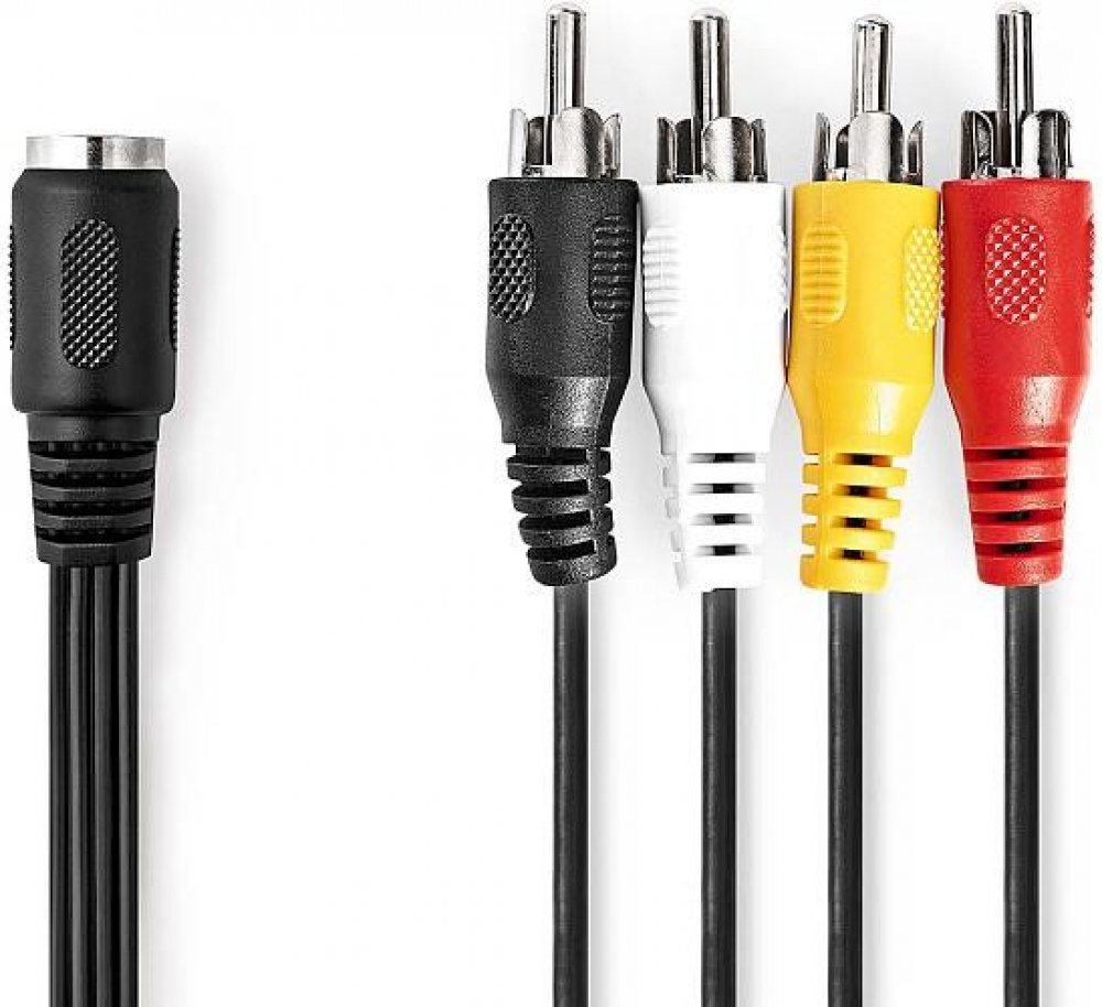 Nedis® propojovací audio/video kabel s konektory 5-pinový DIN zásuvka na 4 x cinch (RCA) zástrčka. Vhodný např. pro připojení staršího VHS přehrávače nebo kamery k zesilovači, TV atd. Délka 0.2 m.