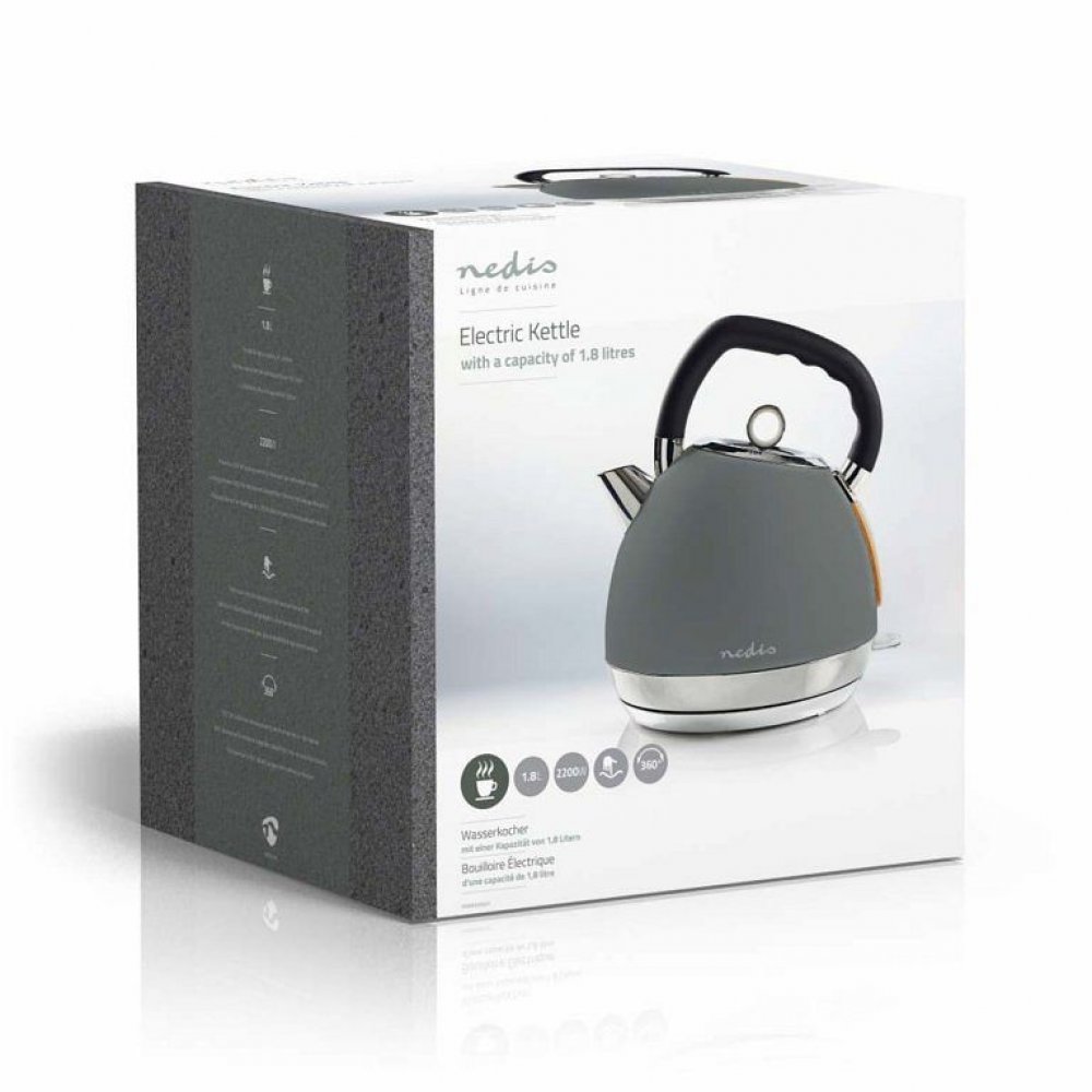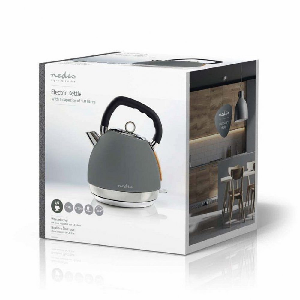 Rychlovarná konvice NEDIS KAWK520EGY Soft-Touch šedá (1.8L, 2200W) Stylová a výkonná rychlovarná elektrická konvice fungující stejně skvěle jako vypadající. Objem 1,8 Litru, rychle vaří vodu a minimalizuje hromadění vodního kamene. Díky kombinaci nerezové oceli, dřeva a gumy představuje naše konvice stylový, odolný a snadno omyvatelný doplněk do Vaší kuchyně. Díky své konstrukci pojme dostatek vody na šest až osm šálků na jedno uvaření, takže na kávu nebo čaj nebude nikdo muset čekat příliš dlouho. Bezdrátová základna otočná o 360° usnadňuje zvedání, a voda se z ergonomicky tvarované konvice pohodlně nalévá, i když je zcela naplněná. Skryté topné těleso s výkonem 2200 W a vyjímatelný filtr zaručují, že voda vždy rychle dosáhne varu, a zároveň brání usazování vodního kamene. Vlastnosti produktu • Objem 1,8 l je ideální pro žíznivé návštěvy • Navíječ šňůry – pro snadné skladování • Filtr vodního kamene zajišťuje, že voda vždy rychle dosáhne varu • Bezdrátová základna otočná o 360° usnadňuje manipulaci • Ochrana před vařením bez vody – konvice se nezapne, pokud v ní nebude dostatek vody Specifikace produktu • Navíječ kabelu • Filtr proti vodnímu kameni • Ochrana proti vaření nasucho • Automatické vypnutí • Skryté topné těleso • Bezdrátová základna 360° • Strix® regulátor • Soft-Touch povrch • Indikátor hladiny vody • Materiál nerezová ocel • Délka kabelu 0.70 m • Kapacita 1.8 l • Výkon 1850-2200 W • Zástrčka Schuko / Typ F (CEE 7/7) • Vstupní napět 220 - 240 VAC Obsah balení • Rychlovarná konvice • Návod