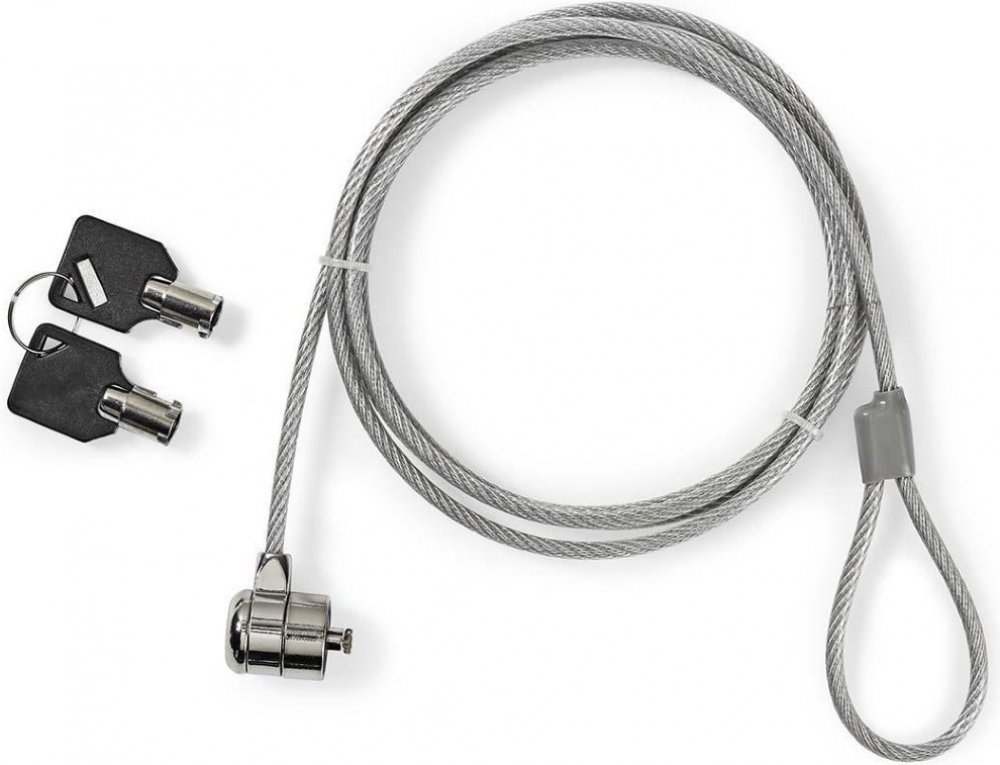 Nedis NBLKK1002ME; Univerzální zámek vhodný k zabezpečení např. notebooku, projektoru, počítače či LCD obrazovky. Lanko je z pevné oceli, měří 1,8 m a ochrání před odcizením. Součástí balení jsou 2 identické klíče. ZÁKLADNÍ SPECIFIKACE; Délka kabelu: ...