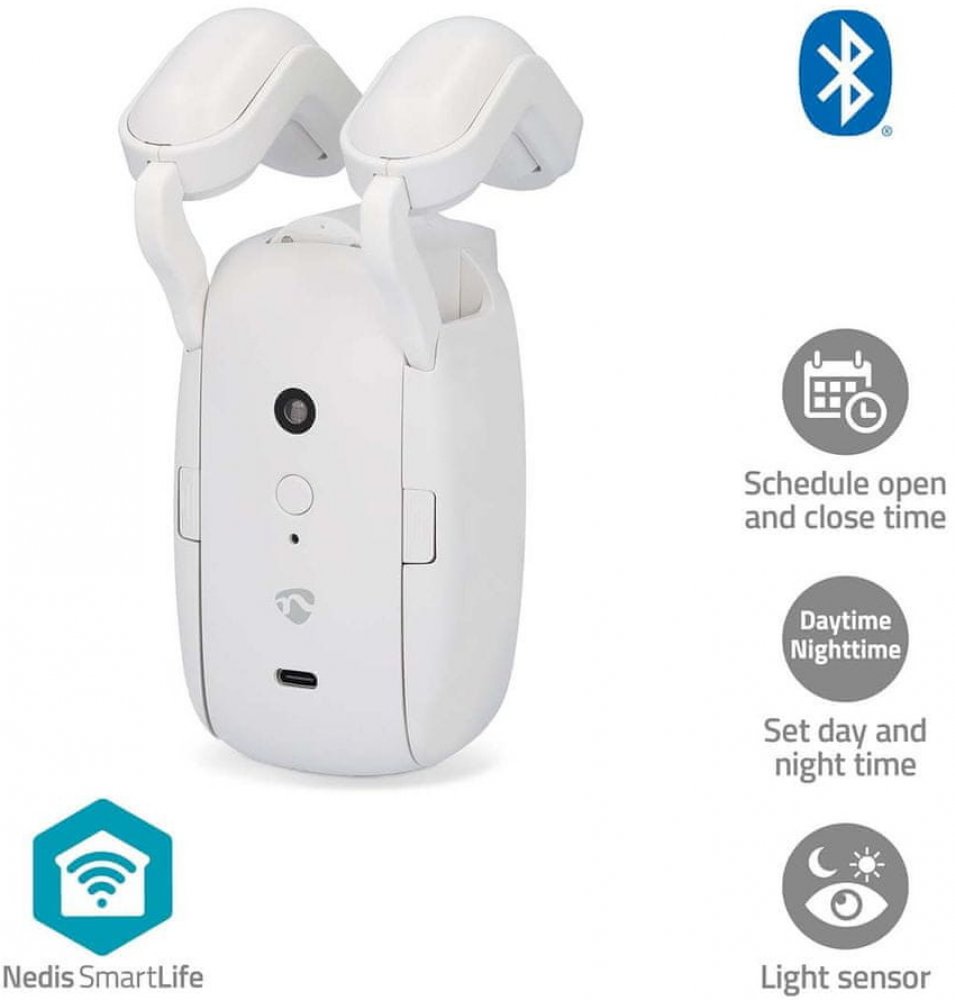 Tento motorizovaný ovladač umožní automatizované ovládání žaluzií a rolet pouze pomocí vašeho telefonu s technologií Bluetooth skrze aplikaci Nedis SmartLife. Po připojení lze aplikaci používat i k nastavení plánů, které otevírají a zavírají více zařízení najednou. Můžete také nastavit otevírací a zavírací dobu podle času západu a východu slunce a probudit se s přirozeným světlem. Ale také je možné nastavit plán, že vaše žaluzie budou automaticky otevřeny, když zazvoní budík. Vedle chytré funkčnosti samotného produktu můžete ovládat žaluzie na těžko přístupných místech, jako jsou vysoká okna nebo například za televizorem. Předností je také podpora hlasové ovládání Google Home a Amazon Alexa. Vestavěnou baterii o kapacitě 2000 mAh lze nabíjet pomocí síťového adaptéru nebo přiloženého solárního panelu. Manuální ovládání je rovněž podporováno funkčními tlačítky na samotném ovladači.