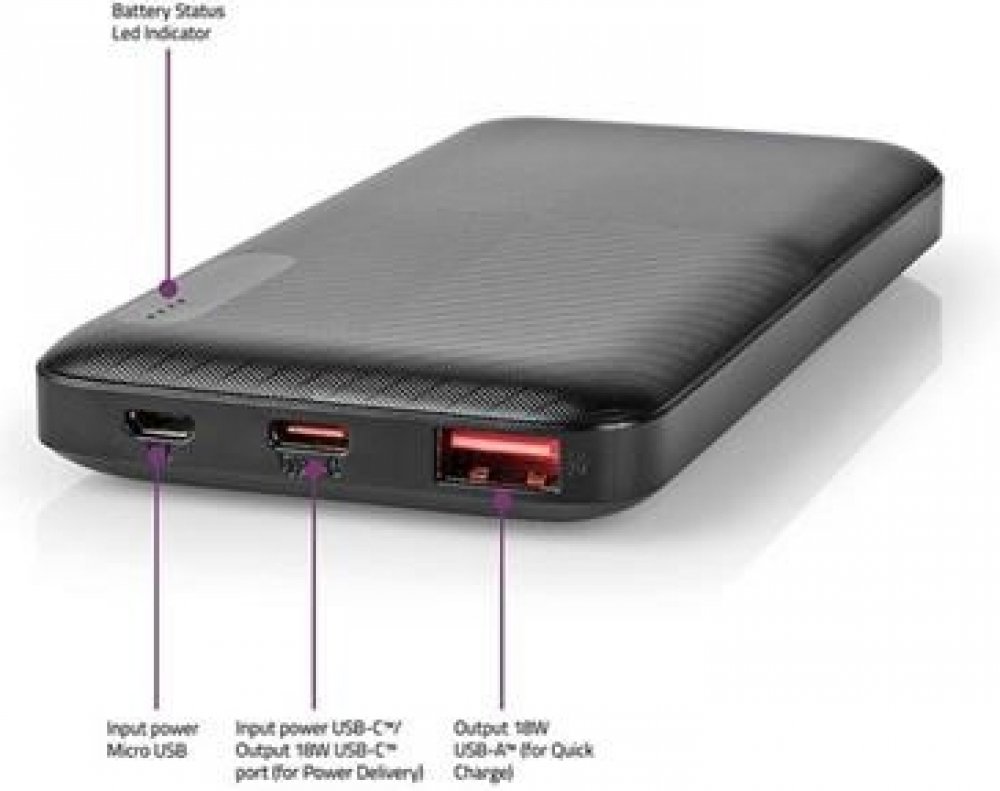 Tuto powerbanku s kapacitou 20 000 mAh můžete používat v domácnosti, kanceláři nebo na cestách k nabíjení dvou zařízení zároveň. Podporuje 18 W USB-C™ Power Delivery (PD) pro rychlé nabíjení Vašeho telefonu z 0–50 % za 30 minut a USB-C™ zařízení z 0–50 % za přibližně 36 minut. Praktický LED indikátor přesně udává zbývající energii, abyste věděli, kdy je nutné zařízení dobít. Obsahuje dostatečné množství energie, abyste si mohli smartphone dobít až osmkrát a tablet až třikrát. Powerbanka nabíz