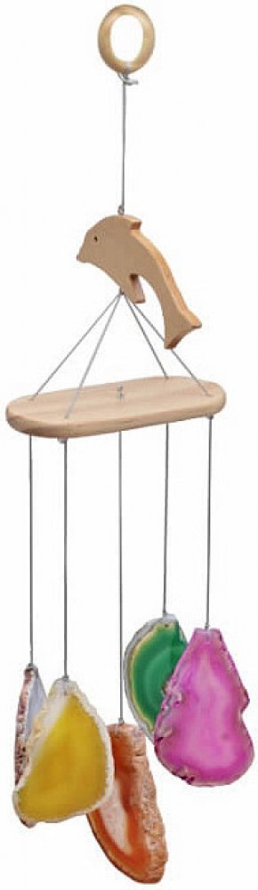 Achátová zvonkohra Multicolor. Závěsná zvonkohra s pěti barevnými achátovými plátky. Vhodná jako dekorace interiérů i exteriérů. Vydává velmi jemný, harmonický zvuk. Velikost achátových plátků je cca 6 až 8 cm, délka cca 38 cm, materiál: přírodní - barvené achátové plátky, dřevo. Ilustrativní vyobrazení přírodního materiál, kdy se může lišit velikost, tvar, struktura a barva od ilustrativních foto...