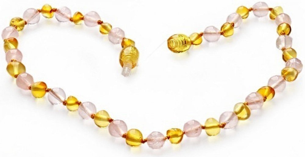 Okouzlující přírodní jantarové korálky pro děti na zoubky z oblých kousků leštěného jantaru nádherné medové barvy s korálky přírodního růženínu. Kousky jantaru, vyleštěné do vysokého lesku, jsou typu "baroque", tedy ohlazených kousků, jež svým kulatým tvarem připomínají kulaté korálky. Chcete-li něco lepšího, než jsou "běžné" dětské korálky, potom stojí za to, vzít do úvahy právě tyto vyjímečně krásné jantarové korálky. Délka korálků cca 31 - 32 cm. Šroubovací uzávěr. Nošení jantarových korálků dětmi je v Evropě tradiční záležitostí, zvláště v období prořezávání zoubků. Ilustrativní vyobrazení.