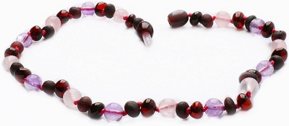 Okouzlující a atraktivní jantarové korálky pro děti na zoubky z leštěných větších kulatých kousků jantaru barvy třešně až tmavě rubínové v kombinaci s kulatými korálky ametystu a růženínu. Korálky a jantary jsou ve velikosti cca 6 - 7 mm. Kombinace jantaru barvy rubínu v kontrastu s ametystem a růženínem je velmi výrazná a atraktivní. Jedná se o zvláště silný ochranný talisman pro děti. Růženín i ametyst jsou talismany lásky a vztahů, včetně rodinných. Úprava korálků: leštěný povrch, na dotek hladce sametový, navozující příjemný pocit teplého povrchu. Délka korálků cca 32 cm. Šroubovací uzávěr. Nošení jantarových korálků dětmi je v Evropě tradiční záležitostí, zvláště v období prořezávání zoubků.
