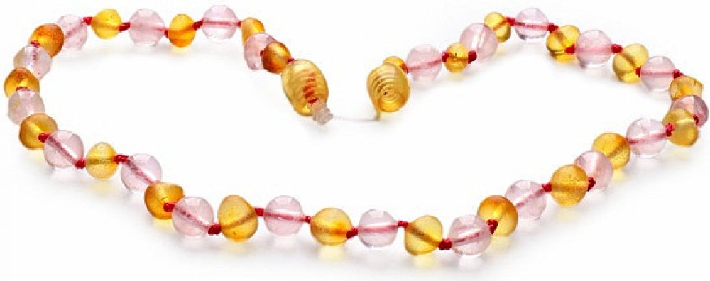 Okouzlující přírodní jantarové korálky pro děti na zoubky z oblých kousků satinovaného jantaru nádherné medové barvy s korálky přírodního růženínu. Kousky jantaru jsou typu "baroque", tedy ohlazených kousků, jež svým kulatým tvarem připomínají kulaté korálky. Chcete-li něco lepšího, než jsou "běžné" dětské korálky, potom stojí za to, vzít do úvahy právě tyto vyjímečně krásné jantarové korálky. Délka korálků cca 31 - 32 cm. Šroubovací uzávěr. Nošení jantarových korálků dětmi je v Evropě tradiční záležitostí, zvláště v období prořezávání zoubků. Ilustrativní vyobrazení.
