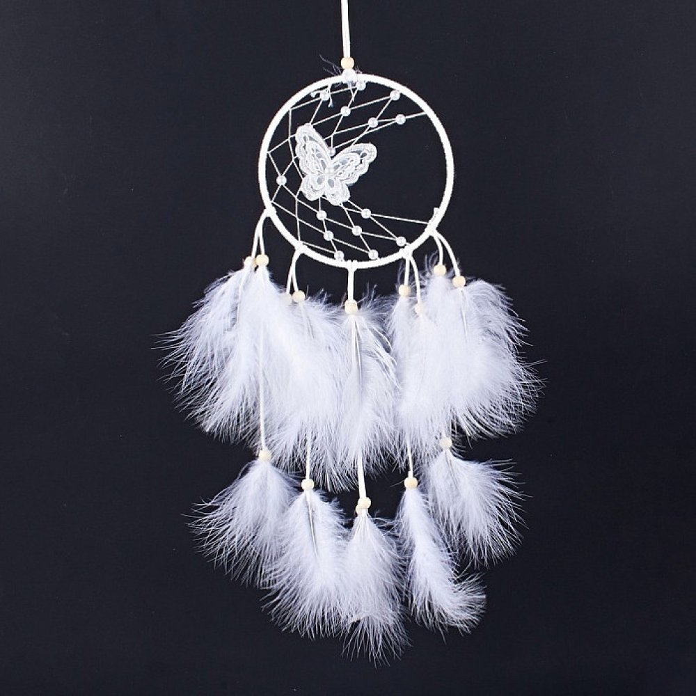 Ručně tkaný lapač snů White Butterfly. Krásná bytová dekorace. V lapači je ručně tkaná síť, je zdoben peřím, dřevěnými a plastovými korálky. Délka cca 56 cm. Ilustrativní vyobrazení.