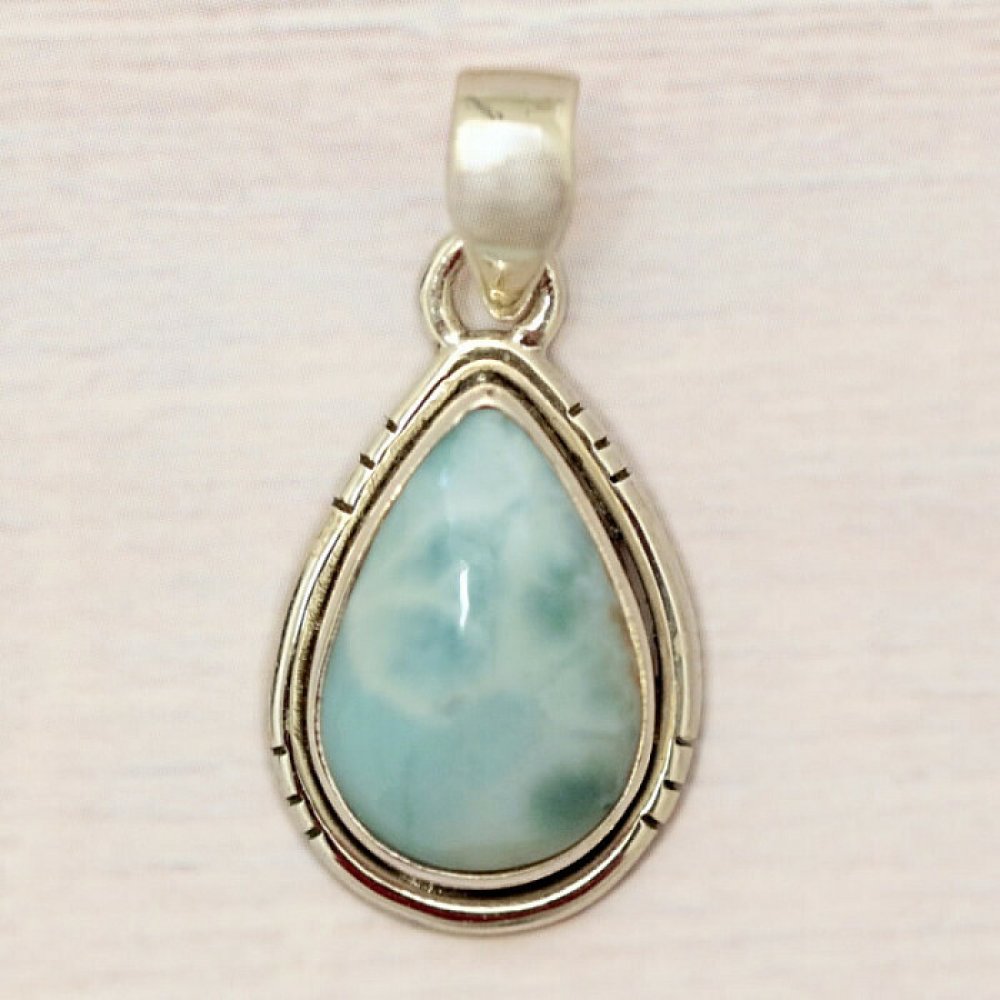 Půvabný přívěsek ze stříbra s krásným a kvalitním kabošonem vzácného larimaru, jenž připomíná hru slunečních paprsků na hladině moře. Šperk je ručně vyroben, larimar je pečlivě vybrán se zřetelně modrým vybarvením. Ag 925. Kupujete přímo vyobrazený šperk.