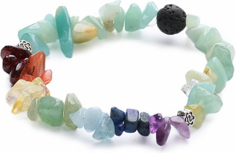 Výrazný čakrový náramek ze sekaných, tromlovaných kousků přírodního, krásně zbarveného amazonitu, navlečených na gumičce neutrální barvy. Náramek je doplněný o korálek z lávy a dva kovové korálky z obecného kovu.