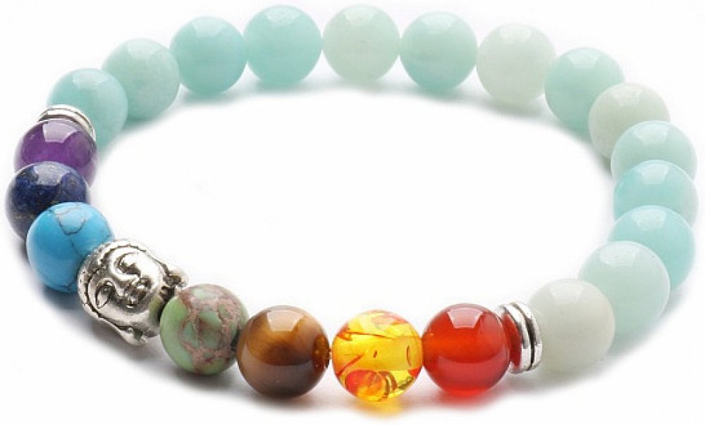 Krásný čakrový náramek z korálků přírodního, krásně zbarveného amazonitu v A kvalitě s čakrovými korálky. Sedm korálků z polodrahokamů v barvách všech čaker harmonizuje a dobíjí energii čaker, těla i mysli. K náramku je připojen kovový korálek ve tvaru hlavy Buddhy, z obecného kovu. Náramek by měl svému nositeli přinášel hojnost a štěstí a plnohodnotný život, jejichž je právě Buddha symbolem. Korá...