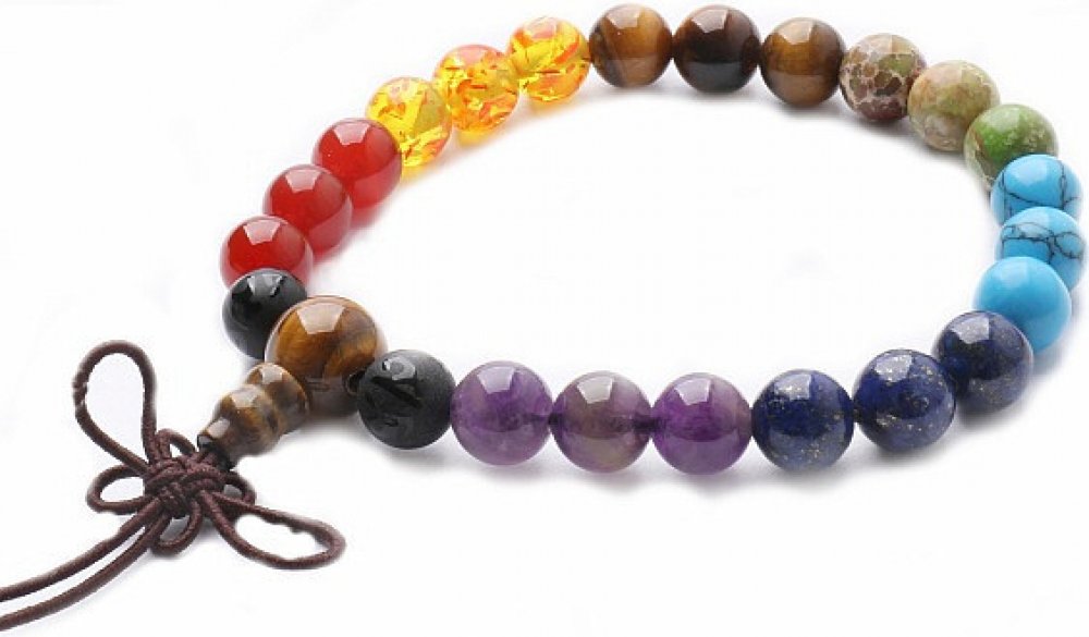 Výrazný čakrový Buddha Mala náramek se sedmi polodrahokamy v barvě jednotlivých čaker a dvěma korálky achátu. Korálky z achátu na sobě nesou nejznámější ze všech manter Om Mani Padme Hum. Kulička učitele, symbolizující moudost, je z tygřího oka. Síla a energie jednotlivých kamenů působí harmonizačně na tělo i duši. Čistí a harmonizují čakry. Projektivní kameny se nosí na pravém zápěstí, receptivní...
