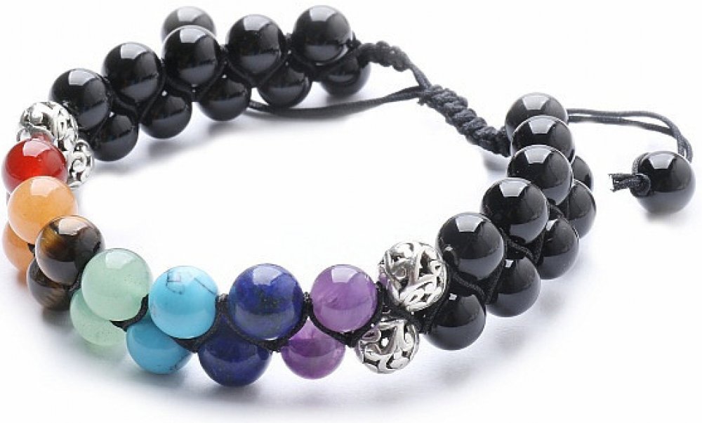 Krásný dvojitý čakrový náramek z korálků přírodního černého achátu s čakrovými korálky a kovovými korálky s tradičními tibetskými vzory. Sedm korálků z polodrahokamů v barvách všech čaker. Nastavitelná velikost náramku pomocí posuvné šňůrky, zakončené dvěma korálky z černého achátu. Velkou předností náramku s tímto zapínáním je jeho flexibilita, kdy je možné náramek natáhnout až na obvod cca 24 cm...