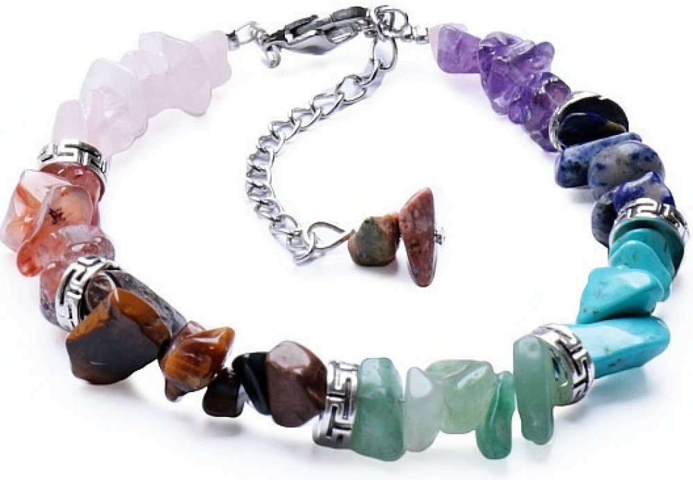 Krásný čakrový náramek z kousků sedmi polodrahokamů v barvách čaker harmonizuje a dobíjí energii čaker, těla i mysli. Náramek je zdoben třpytivými aplikacemi ve Svarowski stylu. Obvod náramku je cca 18 cm, natažitelný díky prodlužovacímu řetízku až na cca 23 cm. Konec řetízku z obecného kovu je zdoben kousky unakitu, bižuterní zapínání. Ilustrativní vyobrazení, barevný odstín, velikost a tvar kame...