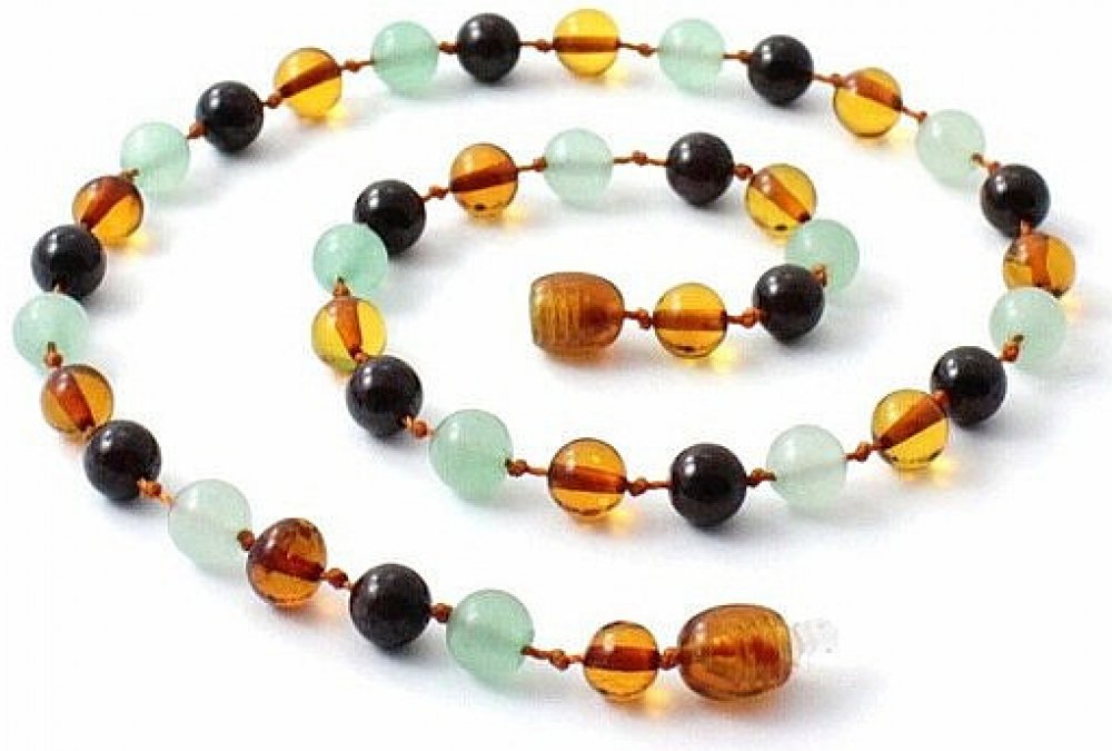 Okouzlující a atraktivní jantarové korálky pro děti na zoubky z kousků jantaru barvy koňaku v kombinaci s kulatými korálky avanturínu a granátu. Korálky drahokamů jsou ve velikosti cca 6 mm, kousky jantaru jsou cca 4 - 5 mm. Kombinace jantaru barvy koňaku v kontrastu se zelenou a červenou barvou drahokamů je velmi výrazná a atraktivní. Jedná se o zvláště silný ochranný talisman pro děti. Úprava korálků: hladký povrch. Délka korálků cca 32 cm. Šroubovací uzávěr. Nošení jantarových korálků dětmi je v Evropě tradiční záležitostí, zvláště v období prořezávání zoubků.