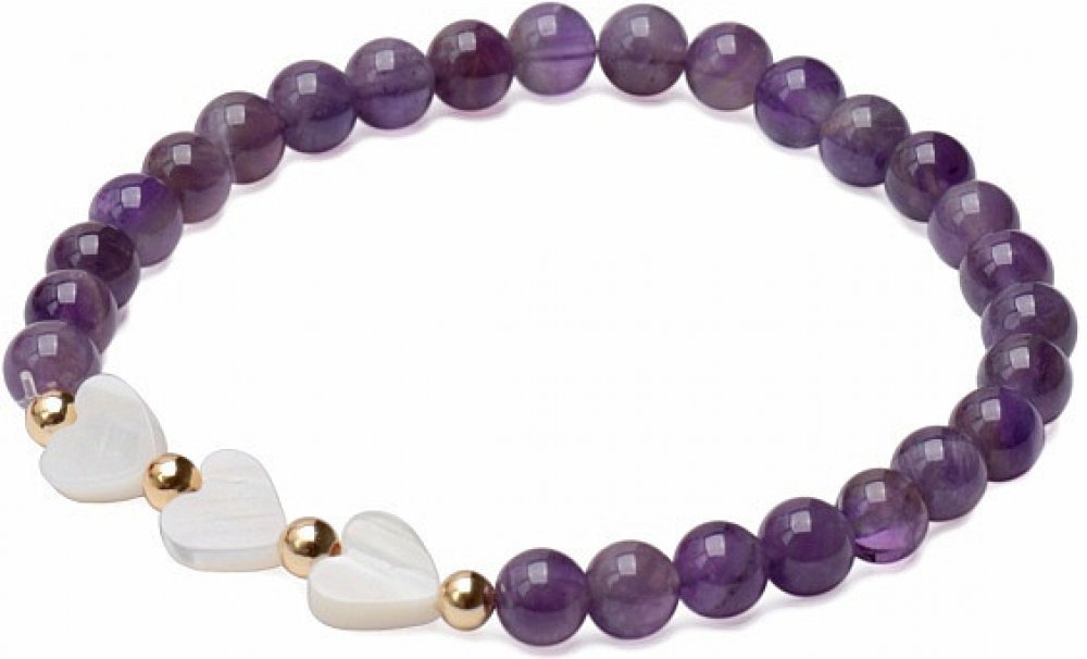 Atraktivní náramek z ametystu se srdíčky z perleti, talismanu nekonečné lásky a nových začátků. Korálky cca 6 mm jsou navlečeny na kvalitní elastické nylonové gumičce, kovové korálky jsou z obecného kovu, velikost srdíček cca 1 cm. Ilustrativní vyobrazení, kupujete přírodní materiál, jednotlivé náramky se mohou od doprovodných fotografií mírně lišit barevným odstínem a kresbou kamene.