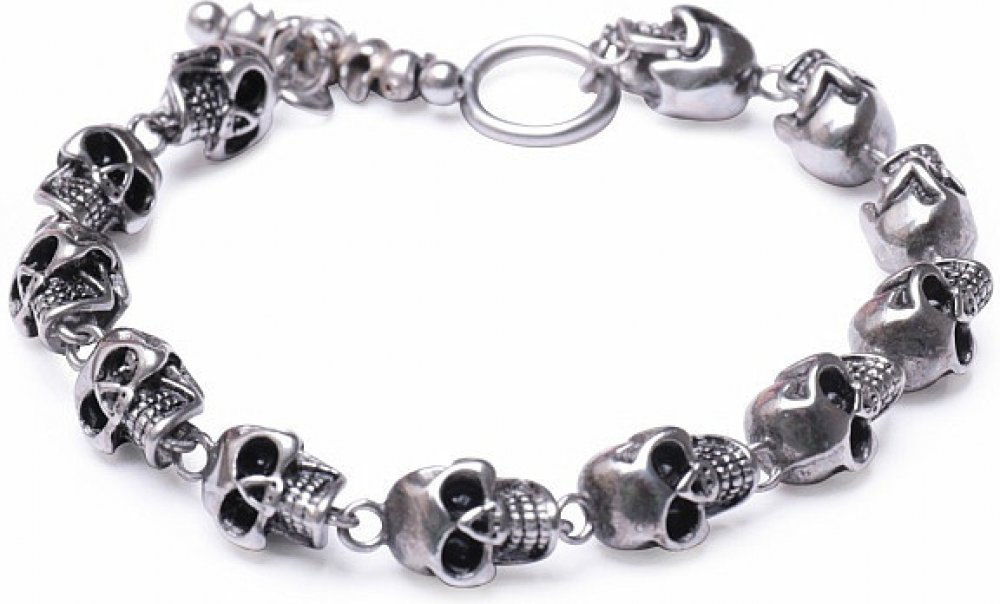 Atraktivní náramek z chirurgické oceli, složený z lebek. Materiál: chirurgická ocel dle DIN 1.4404 (AISI 316L). Americké zapínání, zdobené lebkami. Ilustrativní vyobrazení.