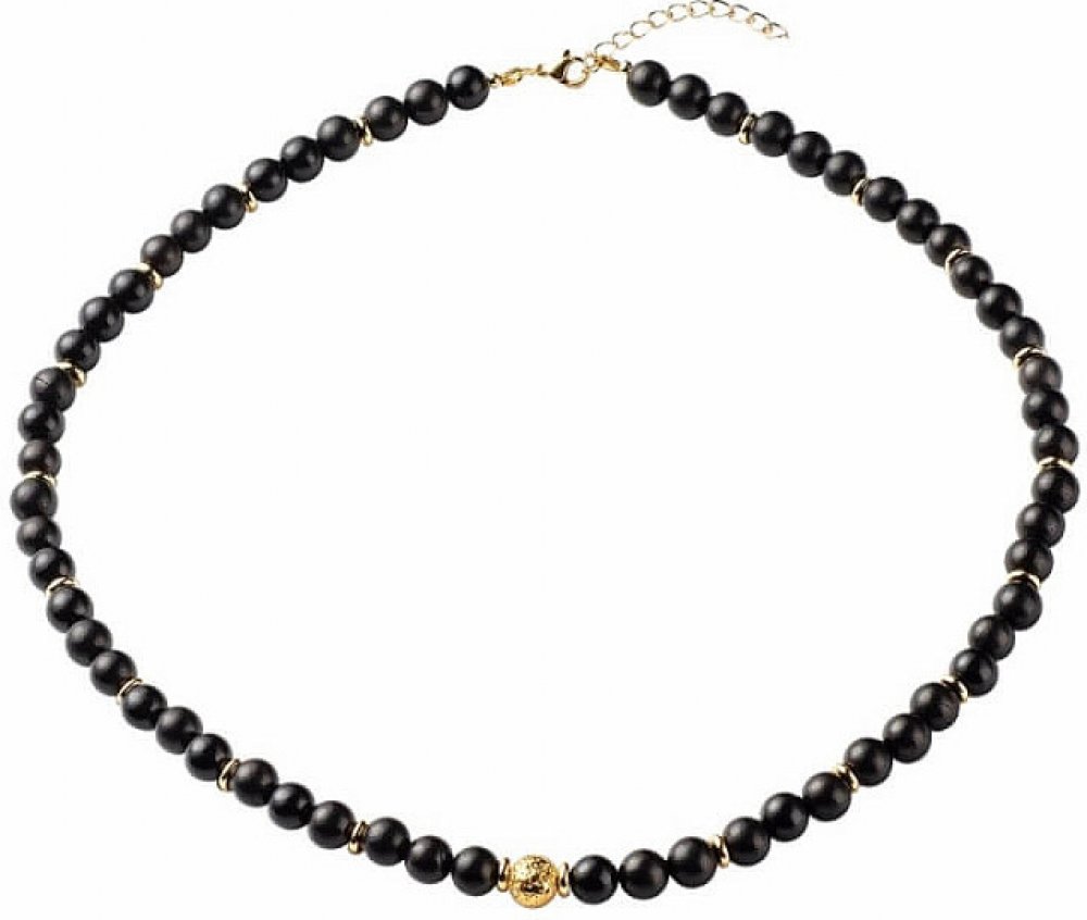 Atraktivní náhrdelník z dřevěných korálků černé barvy s lávou a kovovými korálky v barvě zlata. Módní doplněk pro všechny, kteří cítí sounáležitost s přírodou. Korálky cca 8 mm, délka náhrdelníku je cca 53 cm, lze zapnout až na cca 57 cm, bižuterní zapínání, kovové ozdoby jsou z obecného kovu. Ilustrativní vyobrazení.