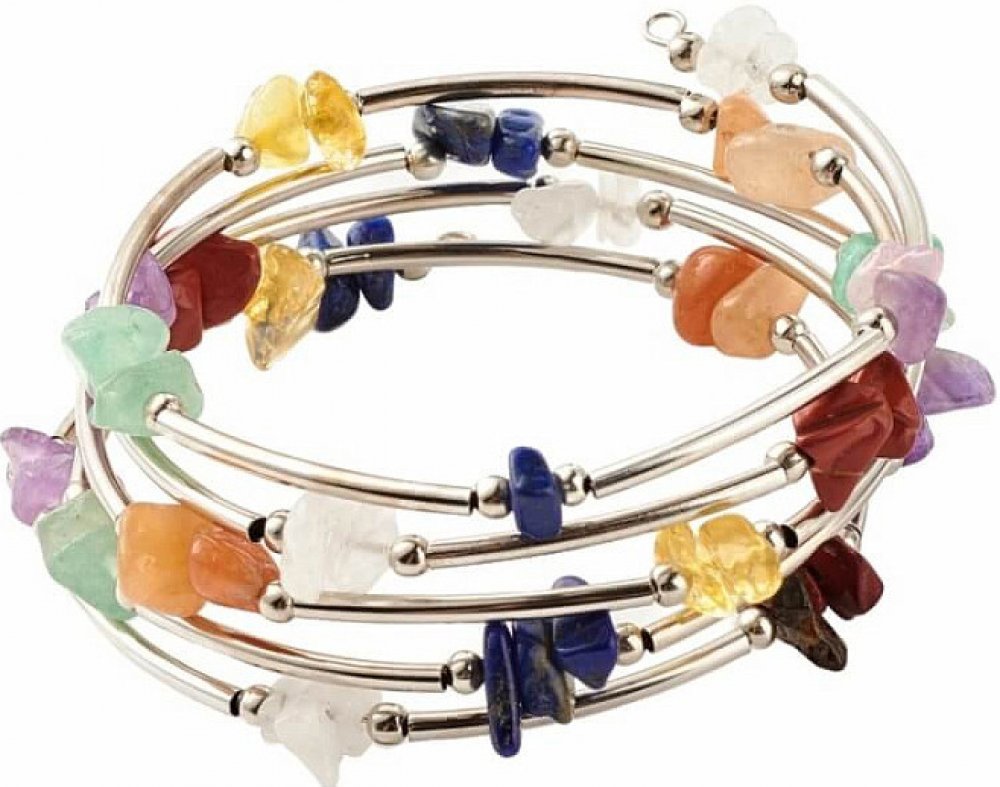 V tomto půvabném šperku je sedm polodrahokamů - červený jaspis, oranžový a žlutý křemen, zelený avanturín, indigo lapis lazuli, fialový ametyst a křišťál.