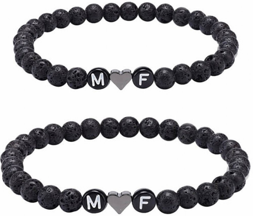 Náramky z lávového kamene pro páry Female and Male se srdíčkem. Materiál: korálky z lávového kamene cca 6,5 mm, obecný kov, akrylát. Korálky jsou navlečeny na kvalitní nylonové gumičce neutrální barvy. Ilustrativní vyobrazení přírodního materiálu, kdy se může lišit struktura kamene od doprovodných fotografií. Vždy však obdržíte náramky srovnatelné kvality.