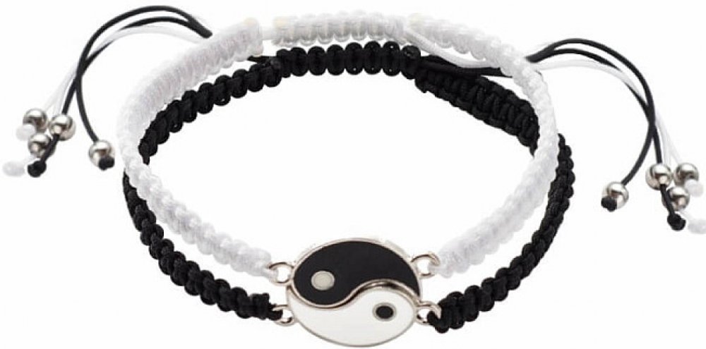 Macramé náramky pro páry Jin a Jang, který symbolizuje jemnou, intuitivní ženskou sílu Jin a aktivní, dynamickou, temperamentní mužskou sílu Jang. Materiál: textilní tkaná šňůrka, slitina, emailový povrch. Ilustrativní vyobrazení.
