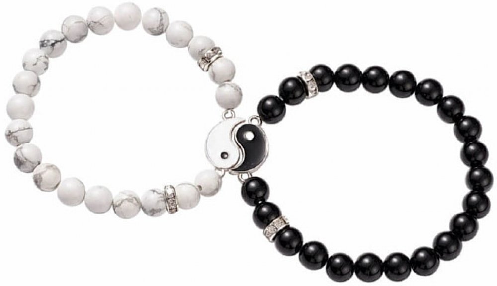 Náramky pro páry z bílého howlitu a černého achátu Jin a Jang, který symbolizuje jemnou, intuitivní ženskou sílu Jin a aktivní, dynamickou, temperamentní mužskou sílu Jang. Materiál: korálky bílého howlitu a achátu cca 8 mm, slitina, emailový povrch a obecný kov. Korálky jsou navlečeny na kvalitní nylonové gumičce neutrální barvy. Ilustrativní vyobrazení přírodního materiálu, kdy se může lišit bar...