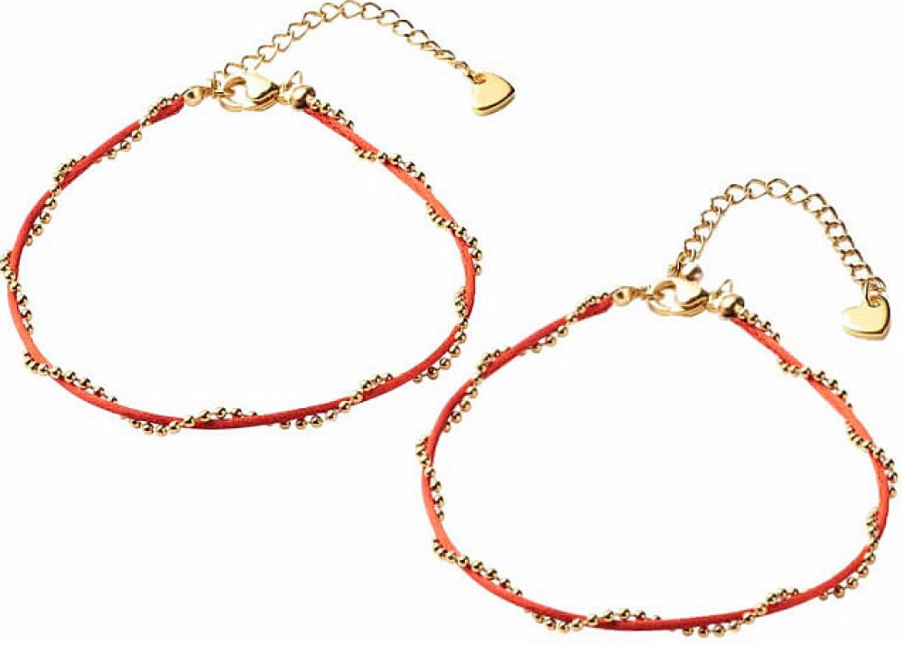 Atraktivní náramky pro páry - dvojité náramky z červené šňůrky a náramku z nerez oceli. Červená je barvou lásky a vášně. Náramky mají bižuterní zapínání. Materiál: nylon, nerez ocel. Ilustrativní vyobrazení.