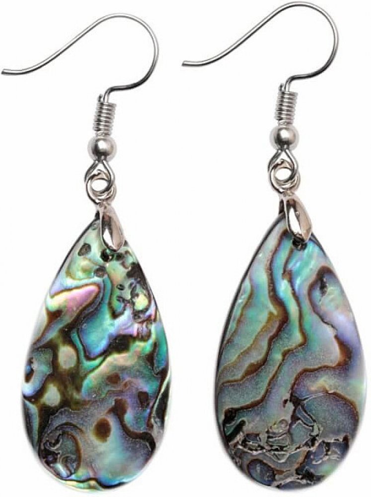 Náušnice Kapky z paua mušlí s nezaměnitelnou duhovou hrou barev. Náušnice mají ztv. afro závěs z bižuterního kovu, délka je cca 5 cm (po zavěšení do ucha). Ilustrativní vyobrazení.