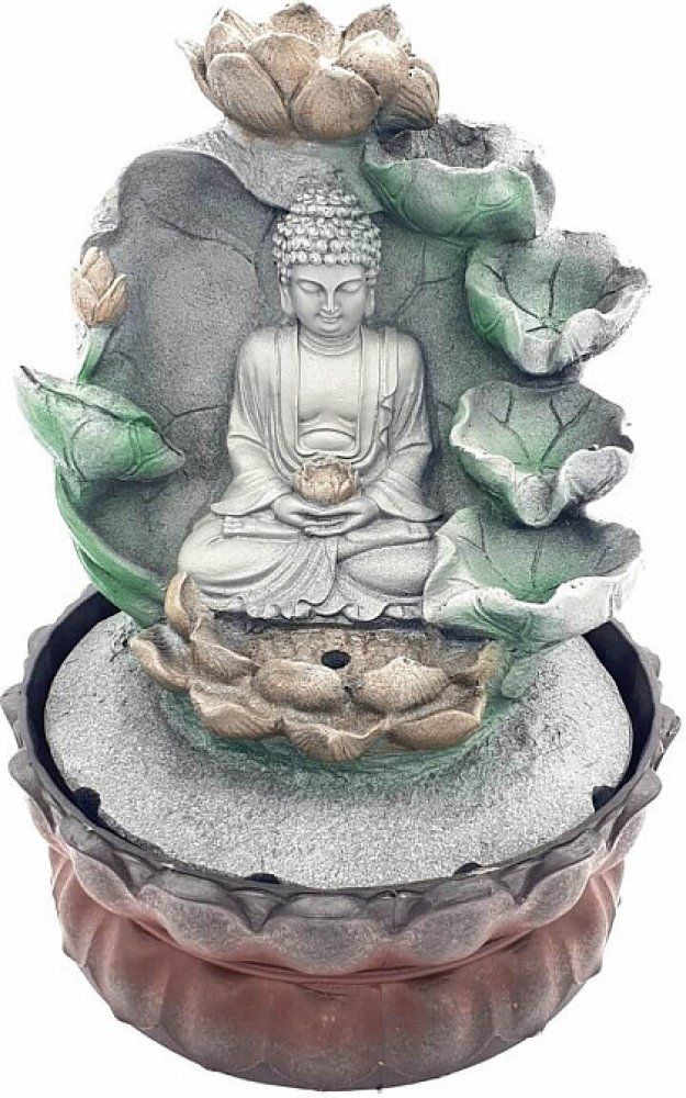 Pokojová fontána Buddha na lotosovém květu s květinovou fontánou s LED osvětlením, s uzavřeným oběhem vody. Krásná dekorace do bytu, kanceláře nebo zimní zahrady, která slouží nejen pro zvlhčení vzduchu. Tekoucí voda uklidňuje pohledem na ni, ale i zvukem. Zvuk tekoucí vody přispěje ke klidu, harmonii a tím celkové relaxaci. LED podsvícení dokreslí atraktivní atmosféru, kterou fontána navozuje. Ma...