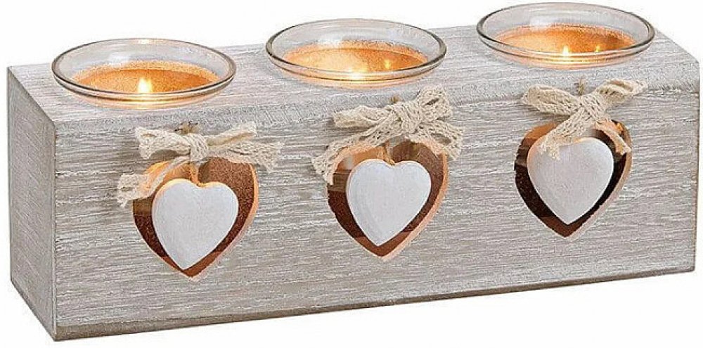 Atraktivní dřevěný svícen pro tři čajové svíčky, zdobené třemi srdíčky, které vnáší do života lásku, štěstí a harmonii. Jedná se o velice hezkou bytovou dekoraci nebo dekoraci vhodnou např. do zimní zahrady. Rozměry: 7 x 8 x 24 cm (hloubka, šířka, výška). Svícen má skleněné kalíšky. Ilustrativní vyobrazení.