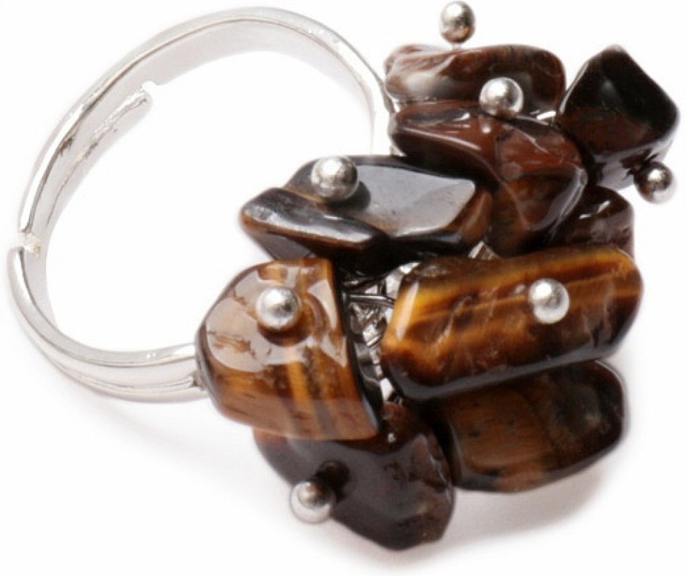 Prstýnek s ohlazenými kousky tygřího oka. Prstýnek je z obecného kovu s nastavitelnou velikostí, velikost 52 mm (US 6) až na 56 mm (US 8). Ilustrativní vyobrazení přídního materiálu, barevnost, tvar a velikost kamínků se může lišit od doprovodných fotografií.