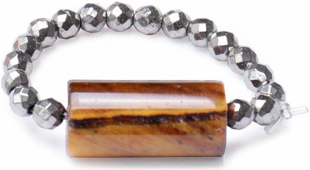 Elegantní elastický prstýnek s válečkem tygřího oka, s korálky z hematitu. Prstýnek je elastický, velikost válečku cca 1,6 cm, velikost 56 mm (US 8) natažitelný až na 63 mm (US 11,5). Ilustrativní vyobrazení přídního materiálu, barevnost, tvar a velikost kamínků se může lišit od doprovodných fotografií.