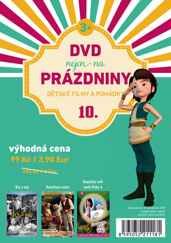 Hry a sny - digipack ČR, 1958, 89 min., čb Hrají: Míša Staninec, Stanislav Neumann, Josef Kemr, Miluška Baliová, Martin Růžek, Vladimír Hrubý, Eva Hrabětová, Eduard Kohout, Ladislav Pešek, Terezie Brzková Poetický povídkový film z pera Ludvíka Aškenazyho Hlavním hrdinou obou příběhů je malý chlapec, který bydlí v Dlážděné ulici. V prvním příběhu nazvaném Malá vánoční chlapec na Štědrý den okouzleně bloudí městem, zatímco v ulicích končí vánoční shon. A i když se ztratil, nepláče. Rozmlouvá s náhodnými chodci, hraje si na opuštěném vánočním trhu a po domově se mu zasteskne až na strážnici, kam ho přivede příslušník SNB. Druhá povídka Milenci z bedny se odehrává v létě „až dozrají meruňky“. Na dvoře pavlačového domu stěhováci složili velkou bednu, která se stane útočištěm milenců i dvou malých dětí. Chlapec a holčička si v ní hrají na tatínka a maminku. A aby tu mohli zůstat, musí se vzít. Holčička tedy nutí chlapečka, aby s ní šel na radnici… Michal Staninec v roli malého chlapce dokázal zaujmout víc než jen dětským žvatláním a k výborným patří i herecké výkony vedlejších postav, například S. Neumanna coby dobráckého taxikáře, L. Peška v roli komedianta, E. Kohouta jako Inda Tondy nebo Martina Růžka hrajícího příslušníka SNB. Za povšimnutí také stojí neopakovatelné záběry staré Prahy, jaká už dnes neexistuje. TITULKY: české pro neslyšící Honzíkova cesta - papírová pošetka ČR, 1956, 73 min., barevný Hrají: Miroslav Červenka, Marcela Jandová, Josef Kruml, Václav Venhoda, Zdeňka Baldová, Vladimír Hlavatý, Karel Höger, Vlasta Chramostová, Radovan Lukavský, Otomar Korbelář, Stanislav Neumann, Štěpánka Haničincová, Jiřina Bohdalová, Josef Hlinomaz Pětiletý Honzík Tichý žije s rodiči v Praze. Jednoho dne přijde dopis na jeho jméno, ve kterém ho dědeček zve k sobě na venkov. Rodiče nemají čas ho tam zavézt. Honzík nakonec přemluví maminku, aby mohl jet sám vlakem. Honzík se na venkově rychle skamarádí s dětmi a zamiluje si všechna dědečkova zvířátka. Zažije spoustu příhod, které jsou pro městského chlapce napínavým dobrodružstvím. Léto však končí a přichází loučení. Honzík však ví, že příští rok určitě zase přijede. TITULKY: české pro neslyšící Kouzelný svět malé Vlnky 6 Krásnou dívenku jménem Vlnka vychovává její dědeček na idylickém, prosluněném ostrově. Jelikož vyrůstá bez matky a otce, je Vlnka terčem posměchu ostatních dětí. Ona se však naučila být nezávislou, nechybí jí silná vůle, je chytrá a má smysl pro humor. Její minulost je spojena s vílou Maureen, lodí plnou zlotřilých pirátů a zlým čarodějem. Poklidný život malé Vlnky se obrátí vzhůru nohama, když čaroděj objeví na mořském dně magickou kouli. Zneužitím její moci může ublížit nevinným lidem. Podaří se Vlnce zastavit zlého čaroděje? Právě začíná napínavý příběh plný úžasných dobrodružství a zábavy. 26 příběhů na 6 DVD Rozpis dílů: 22. Zbloudilý drak 23. Šnečí pole 24. Brána do středu Země 25. Silný protivník 26. Kouzelná země