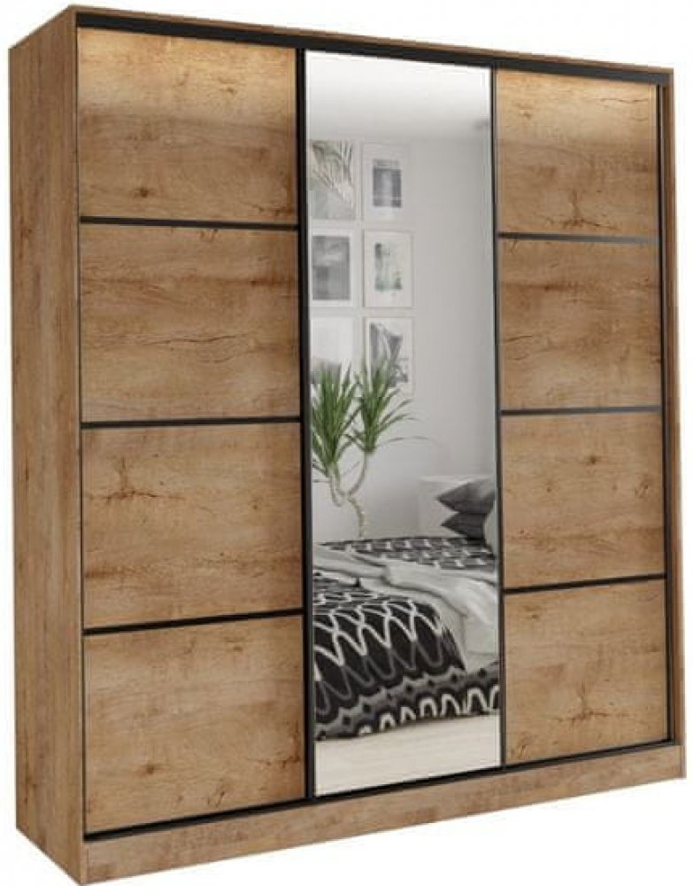 Kombinovaná šatní skříň s posuvnými dveřmi a zrcadlem.Ozdobné lišty, které jsou na dveřích skříně, není nutné na dveře instalovat. Můžete tak mít hladké dveře bez lišt.Rozměry (šxvxh): 150 × 205 × 56 cmMateriál: laminoBarva: dub lefkasŠatní skříň má:- 6 polic- 2 šatní tyče- 4 šuplíkyDodáváno v demon