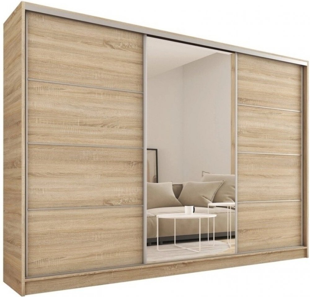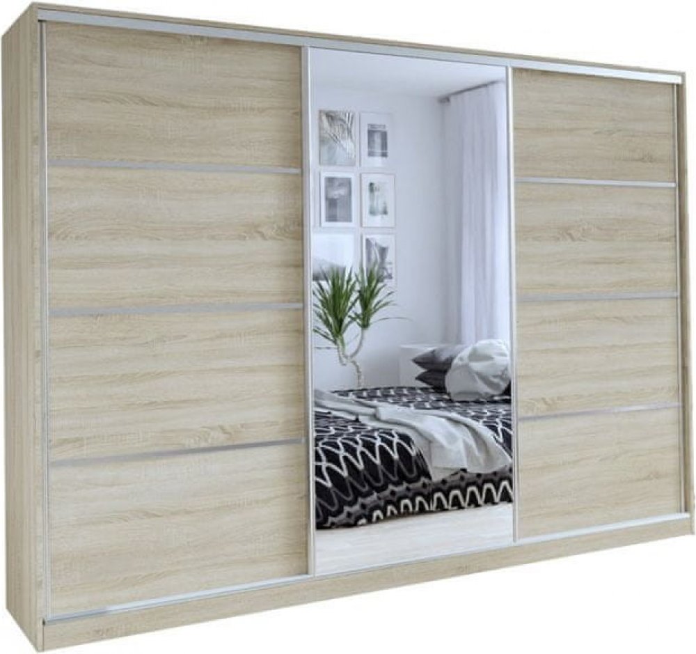 Šatní skříň s posuvnými dveřmi a zrcadlem.Ozdobné lišty, které jsou na dveřích skříně, není nutné na dveře instalovat.