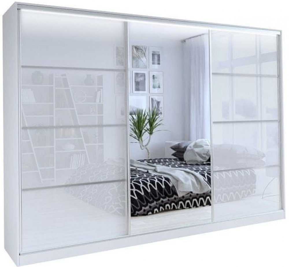 Šatní skříň s posuvnými dveřmi a zrcadlem.Ozdobné lišty, které jsou na dveřích skříně, není nutné na dveře instalovat.Můžete tak mít hladké dveře bez lišt.Rozměry (šxvxh): 280 × 205 × 56 cmMateriál: laminoBarva: bílý leskSkříň má:- 6 polic- 2 šatní tyče- 4 šuplíkyDodáváno v demontu