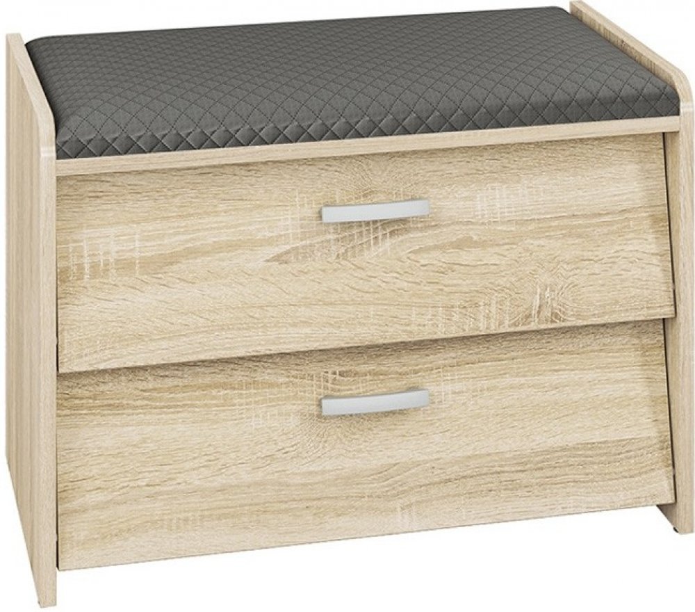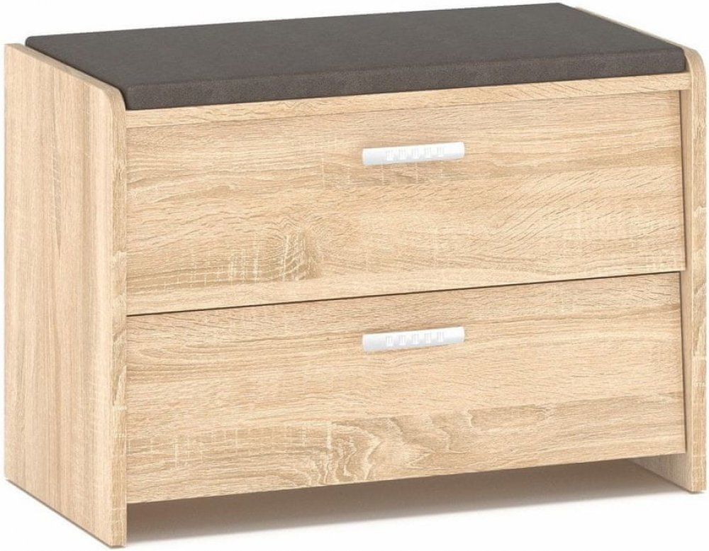 Botník s výklopnými dvířky a čalouněným sedákem.