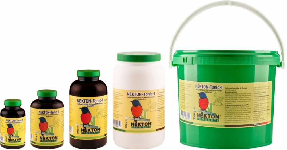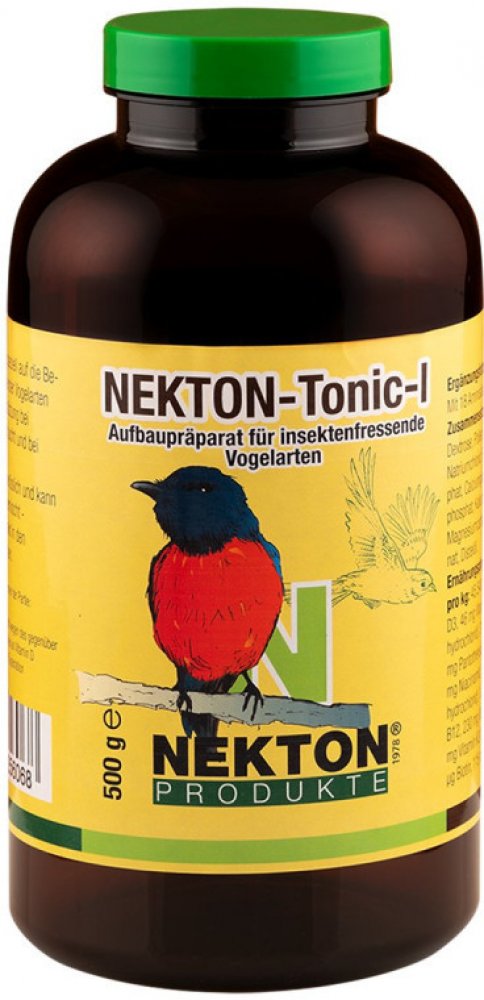 Superkrmivo pro hmyzožravé ptáky. Všechny složky NEKTON Tonic I jsou velmi rychle stravitelné, okamžitě působí na organismus a jsou vhodné jako prevence proti nedostatku vitamínů, aminokyselin, stopových prvků i jako první pomoc v případě oslabení organismu, nemoci, zvýšeného stresu (např. z důvodu transportu, rozmnožování apod.) Vhodné pro dlouhodobé používání i jako rychlá pomoc. Různorodost a kombinace více než 60 výživových substancí činí z preparátu NEKTON Tonic I nepostradatelného pomocníka chovatelů ptáků. Množství a poměr jednotlivých složek je pečlivě kombinováno tak, aby vyhovovalo hmyzožravým ptákům, protože i nutriční požadavky v přírodě se liší podle skladby potravy a potravní specializace. Perfektní potravní doplněk pro dospělé jedince i mláďata. NEKTON Tonic I pro hmyzožravé ptáky obsahuje kompletní směs všech vitamínů, minerálů, stopových prvků a minokyselin. Navíc je však složen z mnoha substancí, díky kterým můžeme tonikum označit jako superkrmivo. Ideální pro všechny hmyzožravé ptáky. NEKTON Tonic I může být po omezenou dobu používán i jako kompletní krmivo. Toto je velkou výhodou u nemocných či oslabených ptáků, kteří přijímají pouze minimum normálního krmiva nebo žádné. Složení: dextróza, včelí pyl, isolát sojového proteinu (bez genetických modifikací), chlorid sodný, fruktóza, sója, fosforečnan draselný, glukonát kalcia, sacharóza, hydrogenfosforečnan vápenatý, chlorid draselný, glycerofosfát vápenatý, uhličitan hořečnatý, kyselina křemičitá, uhličitan vápenatý, olej ze světlice barvířské. Nutriční aditiva / kg: 45,540 IU vitamin A, 2,950 IU vitamin D3, 46 mg vitamin E, 28 mg vitamin B1 (thiamin hydrochlorid), 31 mg vitamin B2 (riboflavin), 23 mg kys. pantothenová (calcium-D pantothenát), 69 mg nikotinamid, 20 mg vitamin B6 (pyridoxin hydrochlorid), 1,5 mg kys. foliová, 2,700 g vitamin B12, 230 mg vitamin C (kys. L askorbová), 9 mg vitamin K3 (menadion-sodium bisulfit), 10,268 g biotin, 115 mg inositol, 115 mg cholin chlorid, 33 mg železo (sulfid železnatý) 0,1 mg zinek (sulfid zinečnatý), 8 mg měď (sulfid měďnatý), 7 mg mangan (sulfid manganatý), 0,09 mg molybden (molybdenan amonný). Technologická aditiva: kyselina sorbová. Dávkování: rozmíchejte 10 g NEKTON Tonic (= 1 velká odměrná lžička, přiložená v balení) ve 100 ml pitné vody (vodu je vhodné obohatit o NEKTON S), nebo posypte 100 g měkkého krmiva 10 g NEKTON Tonic. Nabízejte ptákům 2–3× týdně, nebo denně v případě zvýšeného stresu či onemocnění. Při přímém krmení mláďat doporučujeme přidat vlákninu, např. vařenou rýži, ve které rozmícháme NEKTON Tonic. Uchovávejte na tmavém a suchém místě při teplotě 15–25°C. Neskladujte v ledničce!