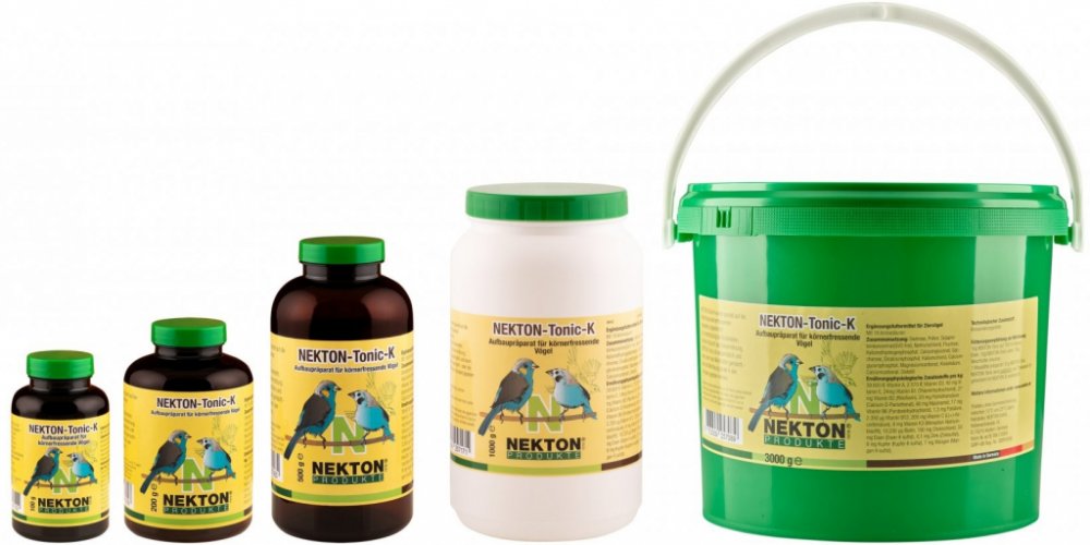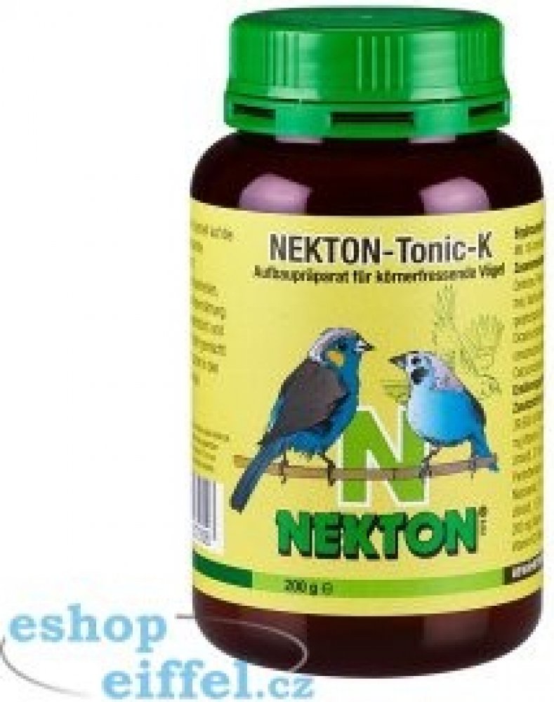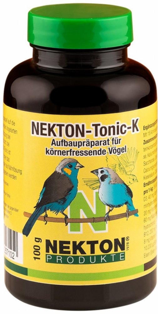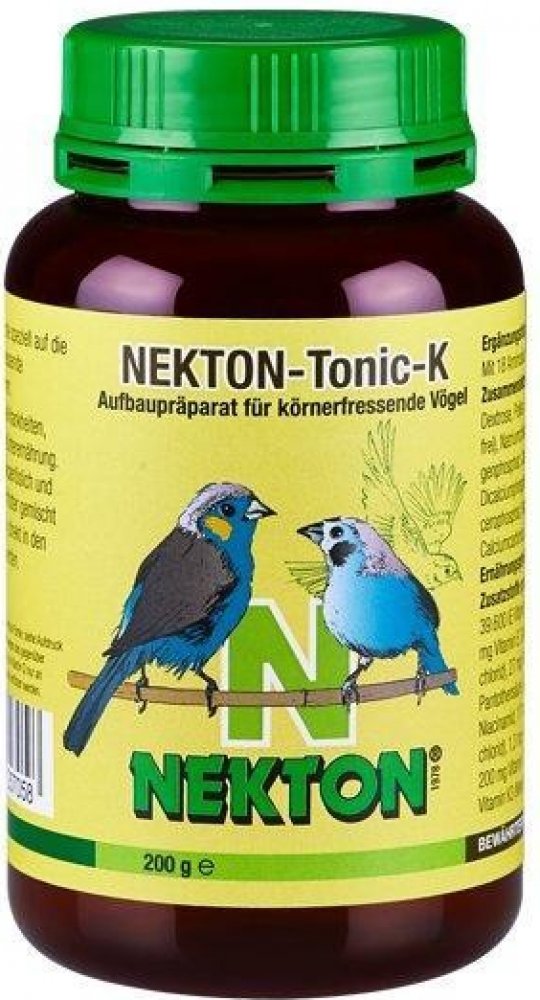 Různorodost a kombinace více než 60 výživových substancí činí z preparátu NEKTON Tonic K nepostradatelného pomocníka chovatelů ptáků. Množství a poměr jednotlivých složek je pečlivě kombinováno tak, aby vyhovovalo zrnožravým ptákům, protože i nutriční požadavky v přírodě se liší podle skladby potravy a potravní specializace. Perfektní potravní doplněk pro dospělé jedince i mláďata.