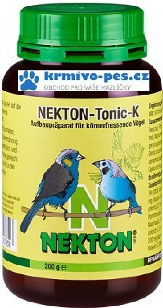Superkrmivo pro zrnožravé ptáky. Všechny složky NEKTON Tonic K jsou velmi rychle stravitelné, okamžitě působí na organismus a jsou vhodné jako prevence proti nedostatku vitamínů, aminokyselin, stopových prvků i jako první pomoc v případě oslabení organismu, nemoci, zvýšeného stresu (např. z důvodu transportu, rozmnožování apod.)