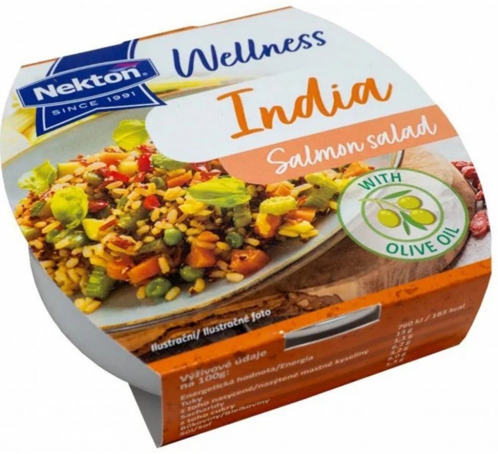 Nekton Lososový salát Wellness India 160 g. Označení Wellness usnadňuje zákazníkům orientaci v produktech a je jistotou při výběru zdravých přírodních potravin s vysokou kvalitou a prospěšnými živinami. Kvalitní potravina do každého šuplíku a spíže. Skvělá jako rychlá svačina v práci nebo po tréninku. Vyvážený poměr bílkovin a sacharidů bohatě zasytí. Vše podtrhuje koření jako je kari, kurkuma, chilli, koriandr a zázvor. Složení: Zelenina 42 % v různých hmotnostních podílech (červená paprika, mrkev, cibule, hrášek), losos obecný – kousky 30 % (Salmo salar), rýže 6,5 %, olivový olej 8 %, pitná voda, směs koření (kari, kurkuma, chilli, koriandr, zázvor, kokosové aroma, jedlá sůl, cukr), kyselina citrónová.