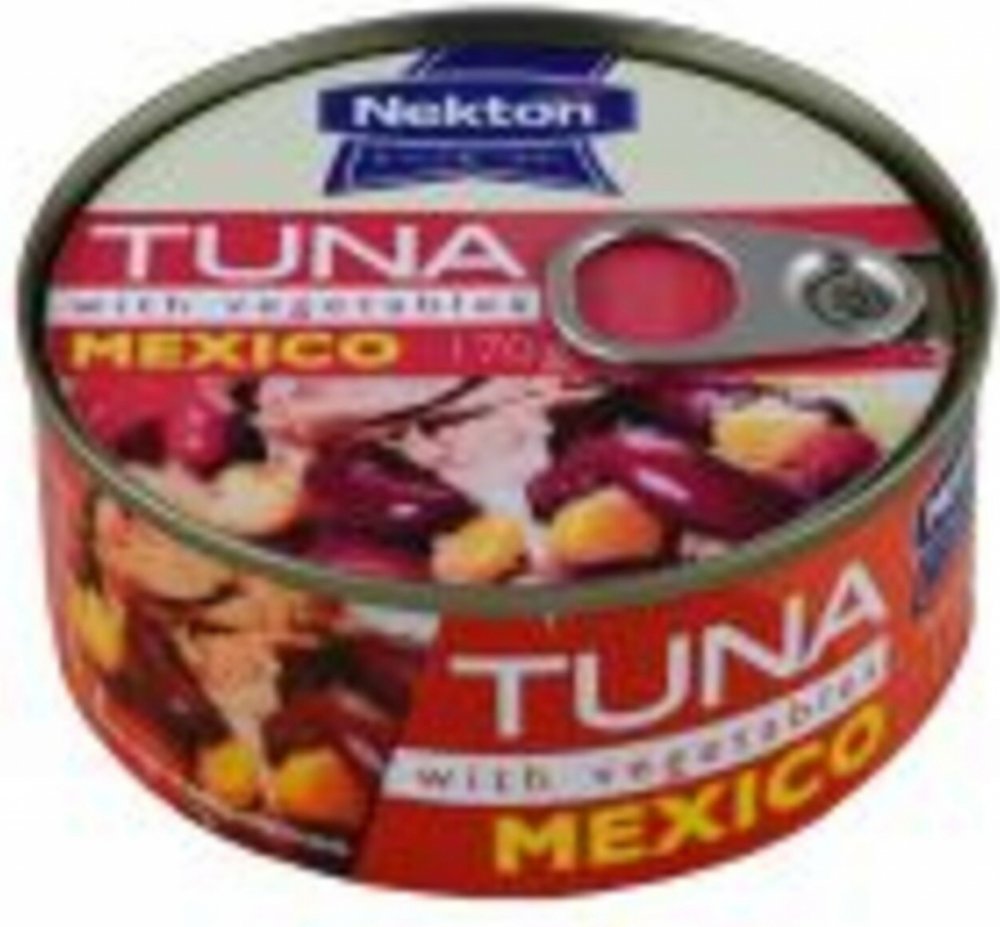 Nekton Wellness salát Mexico 170 g. Příjemný oběd nebo svačina pro milovníky tuňáka, kombinace fazolí a zeleniny vám příjdou vhod kdykoliv nemáte uvařeno, stačí těstoviny nebo rýže Složení: tuňák pruhovaný kousky 26,5 % (Katsuwonus pelamis), zelenina 41 % (červené fazole 15 %, kukuřice 15 %, cibule, červená paprika, zelená paprika), pitná voda, cukr, sójový olej, kvasný ocet rýžový, jedlá sůl, pál...