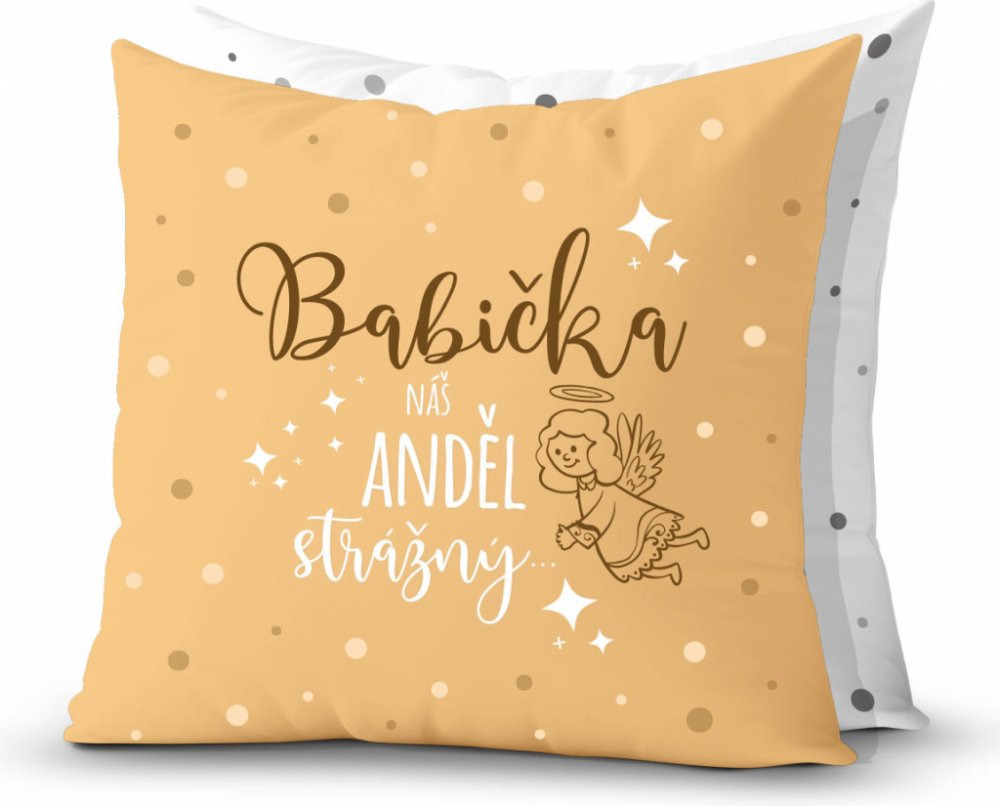 Dárkový polštář s věnováním „babička - náš anděl strážný“. Polštářek je z jedné strany barevný s nápisem, druhá strana je bílá.