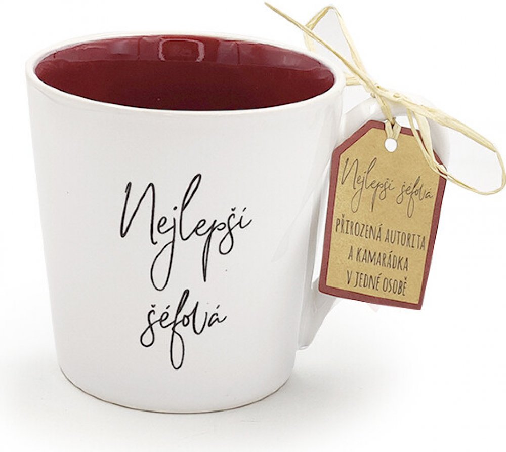 \nElegantní hrneček s věnováním \"Nejlepší šéfová\" ozdobí každou domácnost. Potěšte tímto hrnečkem svoji skvělou šéfovou. \nObjem: 300 ml\nRozměr: o 9,3 x 9,5 cm\nMateriál: keramika\nHrnek je vhodný