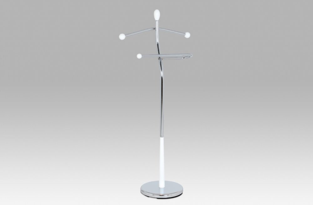 Praktický minimalistický němý sluha v sobě kombinuje prvky z masivního kaučukovníkového dřeva s kovovými nosnými díly v chromované povrchové úpravě. Tento model je laděn seversky, v bílém matném laku. Výška 120 cm Vám umožní zavěšení oblečení i doplňků zcela bez pomačkání. Nosnost stojanu je až 5 kg rovnoměrně rozprostřené zátěže, hmotnost 5 kg. Konstrukce je zakončena kovovou chromovanou podestou...